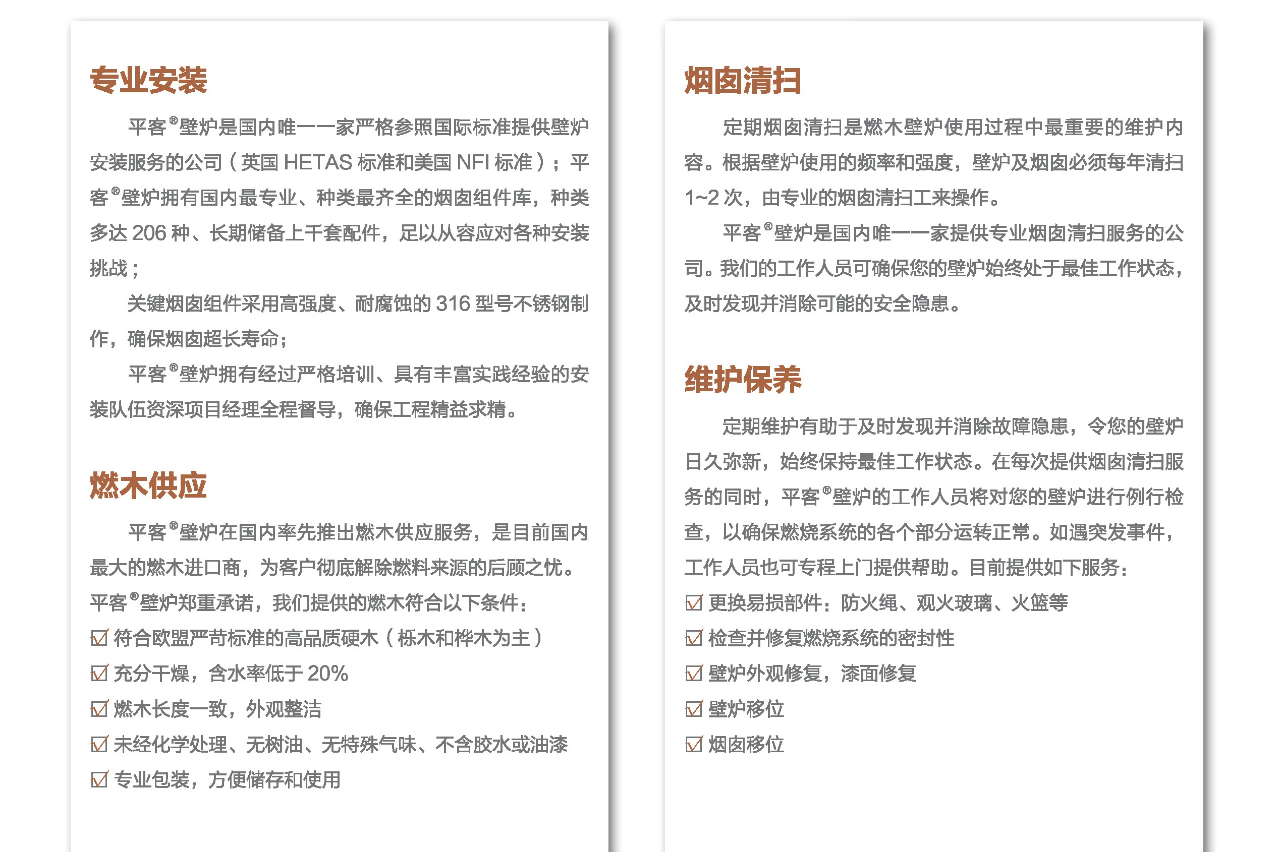平客壁爐于2010年在南京創立,是中國最早開展壁爐業務的公司之一。從成立之初,平客壁爐就奉行“產品+服務”的經營模式,為客戶提供從咨詢、設計、安裝、維護、煙囪清掃到燃木供應的全方位服務,公司目前已經在南京、上海、沈陽、大連等地開設了壁爐體驗中心,杭州、武漢兩地的壁爐展廳亦在籌劃之中,能夠在全國范圍內提供上門安裝服務。