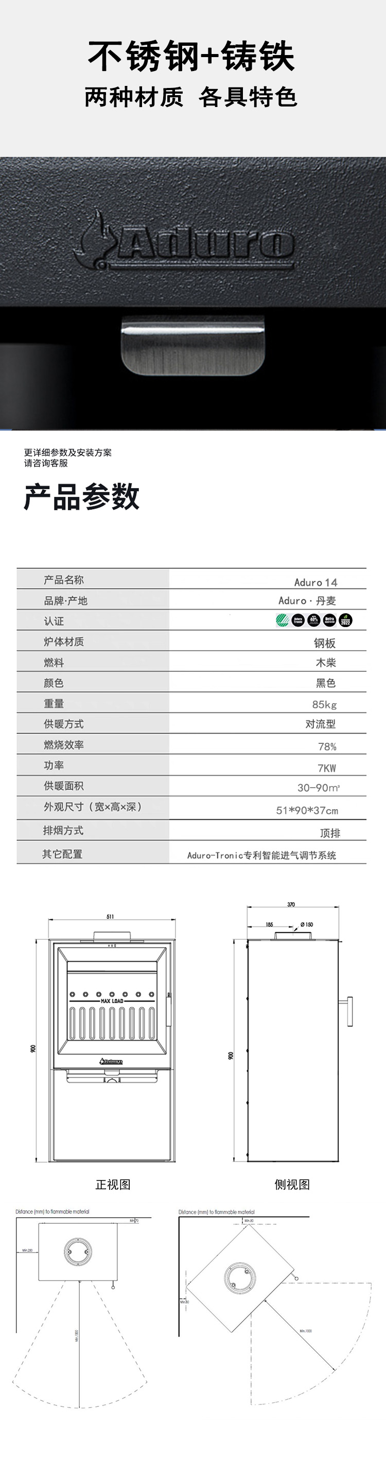 官方售價:19800;峰值功率7KW,供暖面積30-90㎡,效率78%,尺寸51*90*37cm。Aduro 14 是一款強大且高效的取暖設備,符合北歐白天鵝環保認證、Ecodesign 2022排放認證。立體式的設計將不銹鋼和鑄鐵結合,不銹鋼的現代感與鑄鐵材質的質樸形成鮮明對比,簡約而又經典。