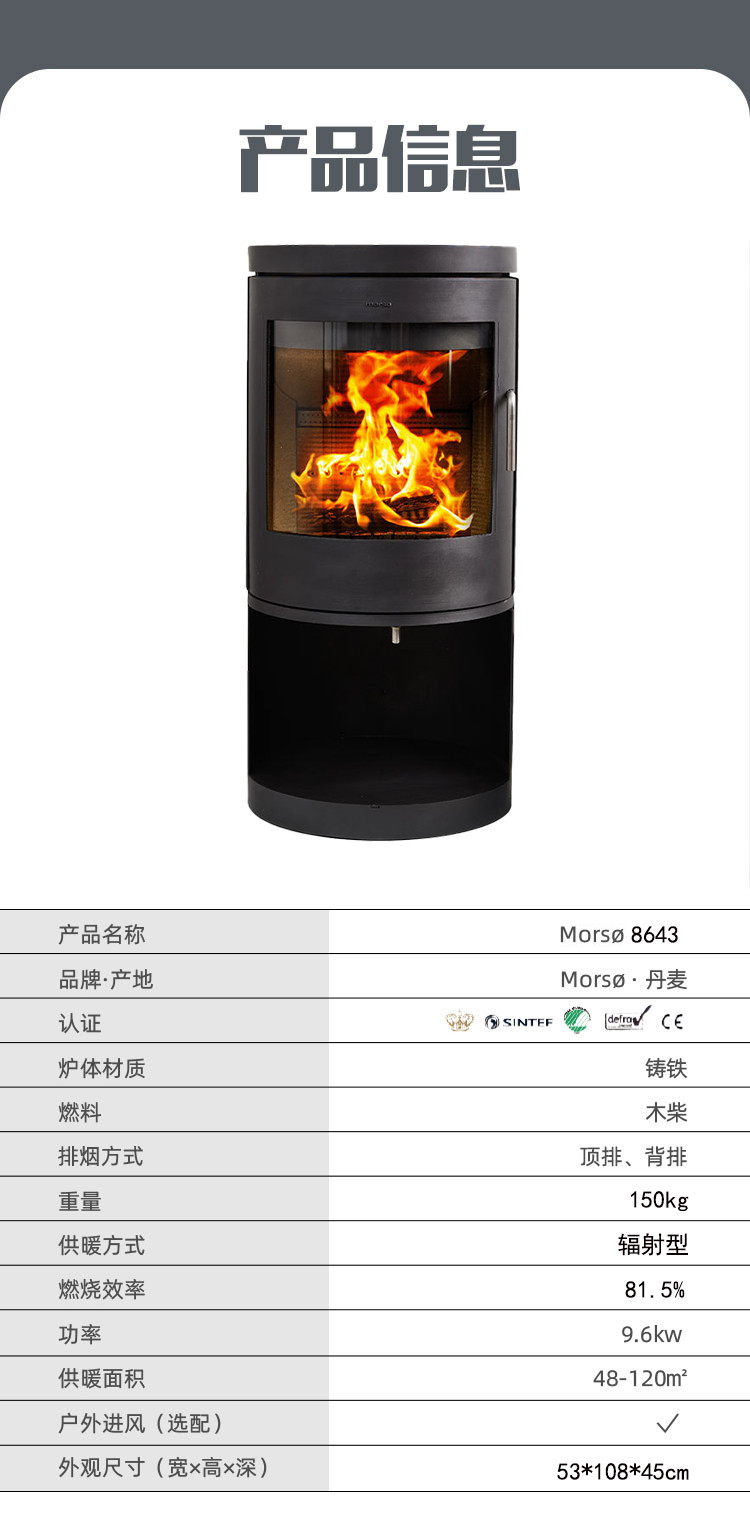 | 產品亮點: | 官方售價:¥69800,峰值功率9.6KW,效率81.5%,外觀尺寸53*108*45cm,供暖面積48-120平方。Morso 8643采用全新的內部設計,結合6100和8100系列超高溫燃燒技術,使得它成為全球“最強大”的燃木火爐之一。干凈簡約的設計風格,看似簡單卻不失經典,這可以讓您在使用幾十年后依舊不會過時,可選配戶外進風,頂排/背排兩種安裝方式! |