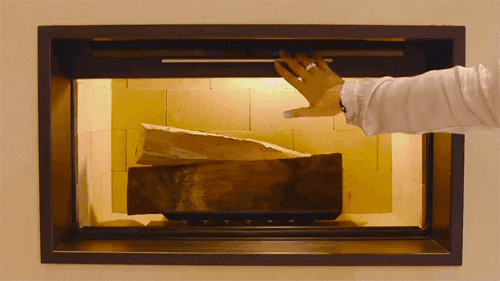 TOTEM提供了兩套機構來控制壁爐的熱量輸出,一個是進風控制閥,另一個是風門控制桿。前者控制著木柴燃燒的劇烈程度(氧氣越充足燃燒越劇烈),后者控制燃燒尾氣的排放速度(排煙速度越快,流失到戶外的熱量越多,反之則可將熱量更多地留在室內)。下圖顯示了進風控制閥的工作原理:向外拉動手柄進風增加,向內推進手柄進風減小。需要說明的是進風控制閥只能控制主進風風量(從爐珊底部進入爐膛的氣流),另外兩股進風即頂部進風和背部進風是不受控制的,無法關閉,因此你會發現在爐火完全燃燒起來之后即便完全關閉進風控制閥爐火仍然不會熄滅,僅僅是燃燒沒有那么猛烈了而已。
