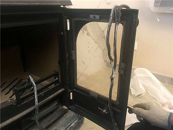 需要特別注意的是首次點火不要加入太多木柴(1~2kg燃木即可),爐門虛掩,留一條小縫,待木柴燒光,爐體徹底冷卻后再關閉爐門,這樣可以避免爐門密封繩與爐體粘在一起,下次開門時被撕扯脫落。下面幾張照片顯示的就是首次點火時爐門關死,第二次打開爐門時密封繩被撕掉的情景。(密封繩上有油脂,高溫下會熔融產生粘性)